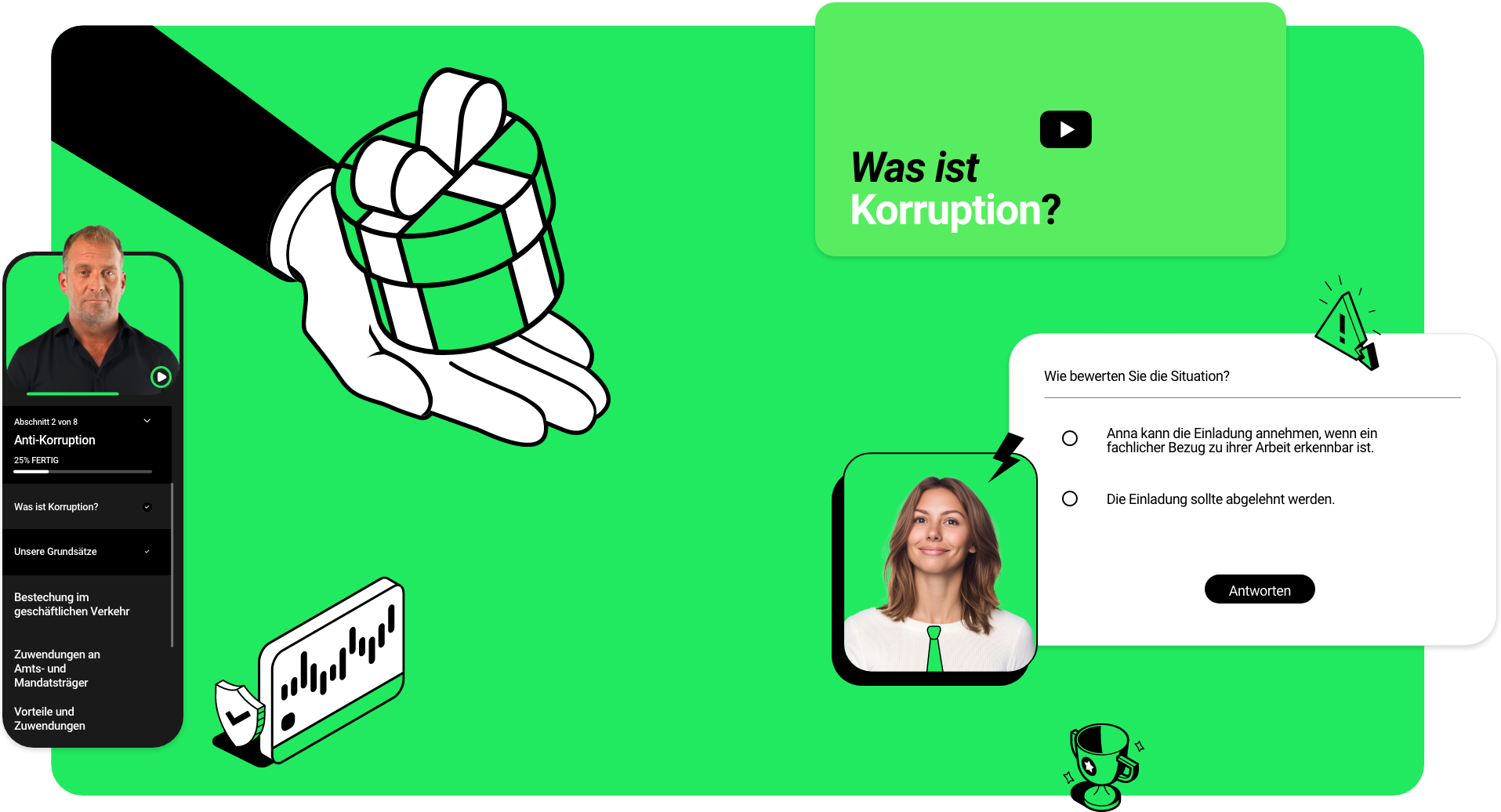 Durch Compliance-Schulungen lernen Mitarbeitende, wie sie sich gesetzeskonform, sicher und ethisch korrekt verhalten. Sie erhalten das notwendige Wissen, um Vorschriften, Richtlinien und Gesetze im Arbeitsalltag umzusetzen. Das stärkt das Verantwortungsbewusstsein und fördert eine Unternehmenskultur, in der Integrität und Transparenz gelebt werden.