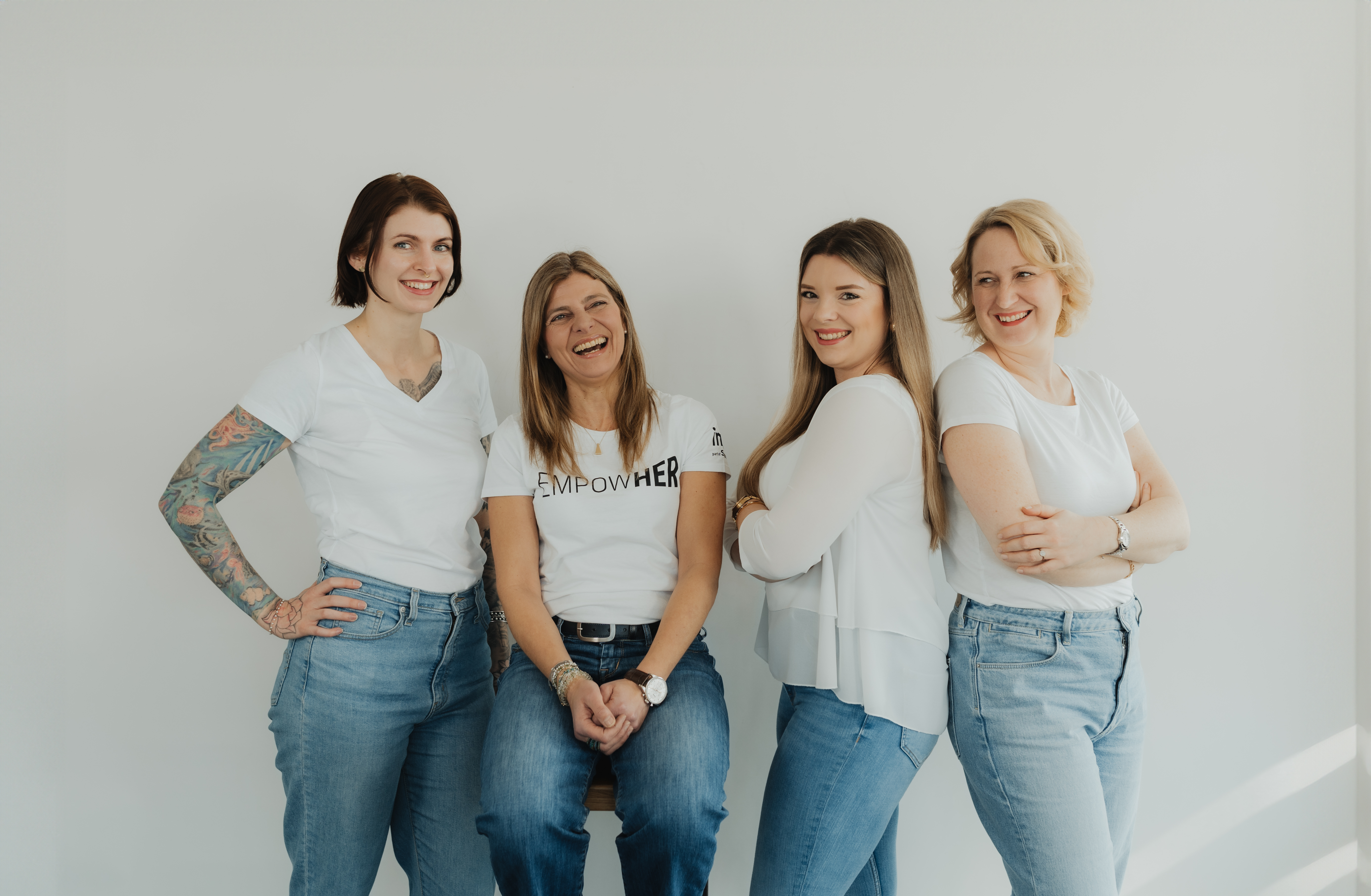 Projektverantwortliche Anna und die ehemaligen Teilnehmerinnen Carlotta, Doreen und Mitgründerin des Programms Kerstin