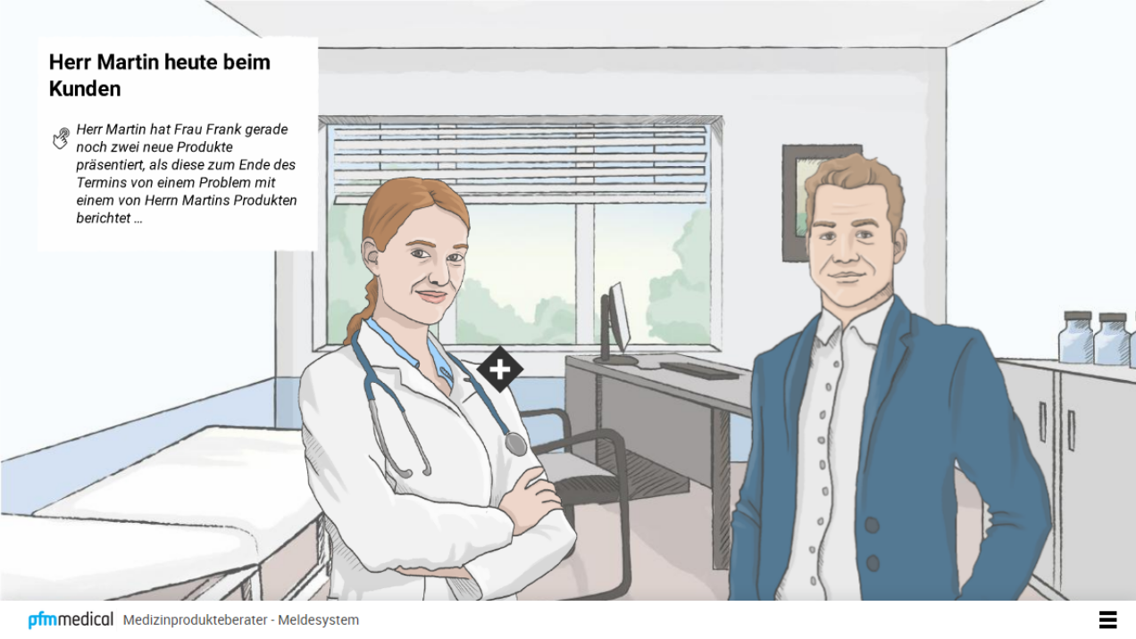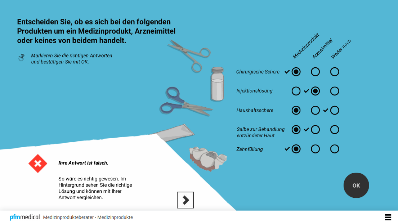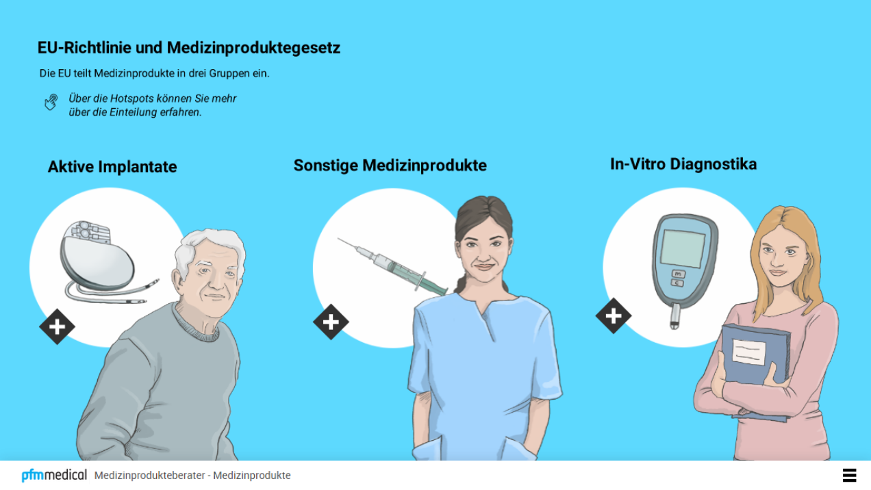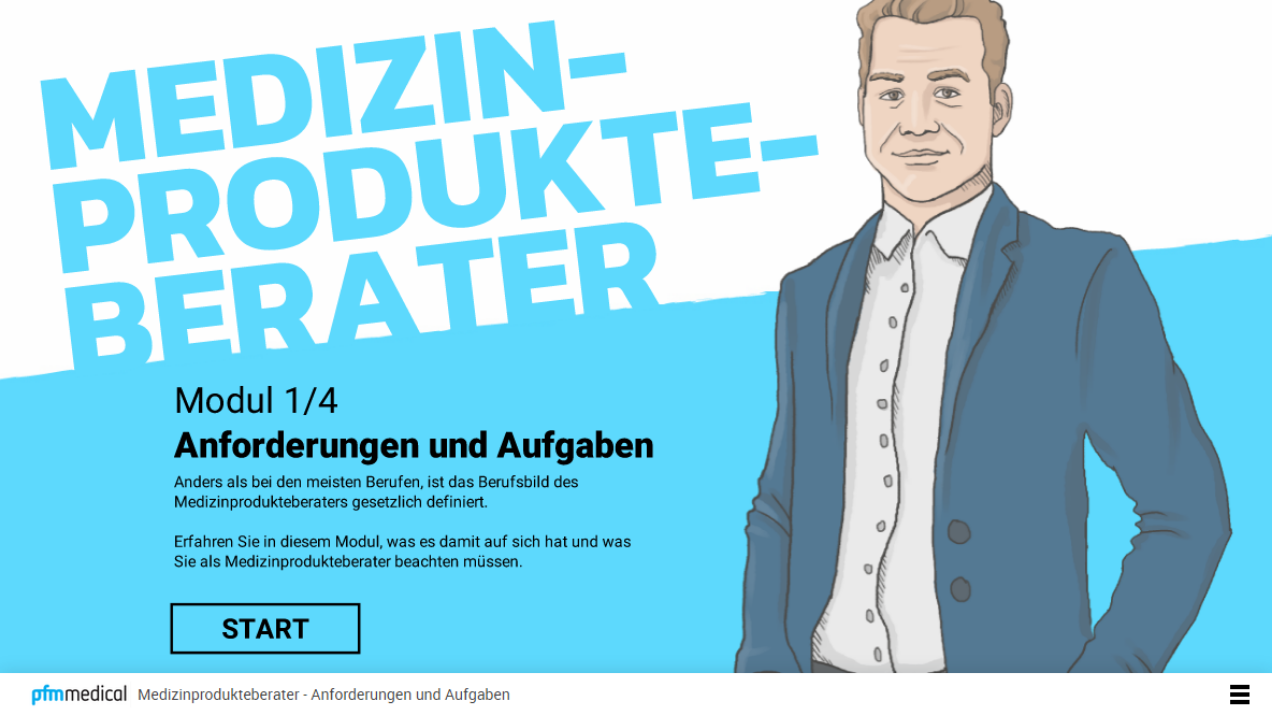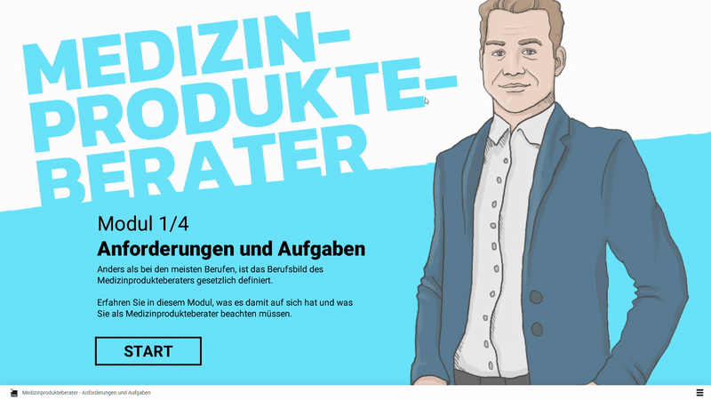 Unser E-Learning „Die Medizinprodukteberater“ dient dem Wissensaufbau und Einstieg in die Welt der Medizinprodukteberater. Der Lerner erfährt mehr über das Berufsbild des Medizinprodukteberaters, was dabei zu beachten ist, wie man Medizinprodukte von anderen Produkten unterscheidet, welche Kennzeichnungen auf Medizinprodukten angebracht sind und was bei Problemen mit einem Medizinprodukt geschieht. Hat der Lerner alle 4 Module durchlaufen, wird folglich ein Abschlusstest freigeschaltet, in dem er sein erworbenes Wissen testen kann. Bei einem erfolgreichen Abschluss wird ein Zertifikat ausgestellt.