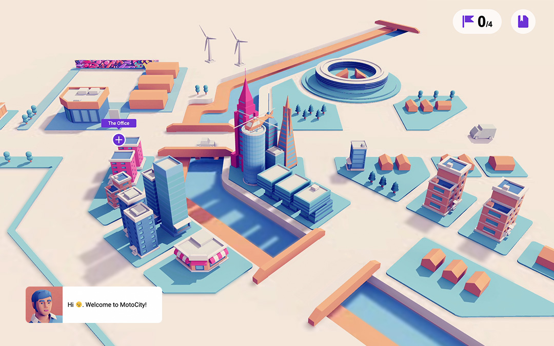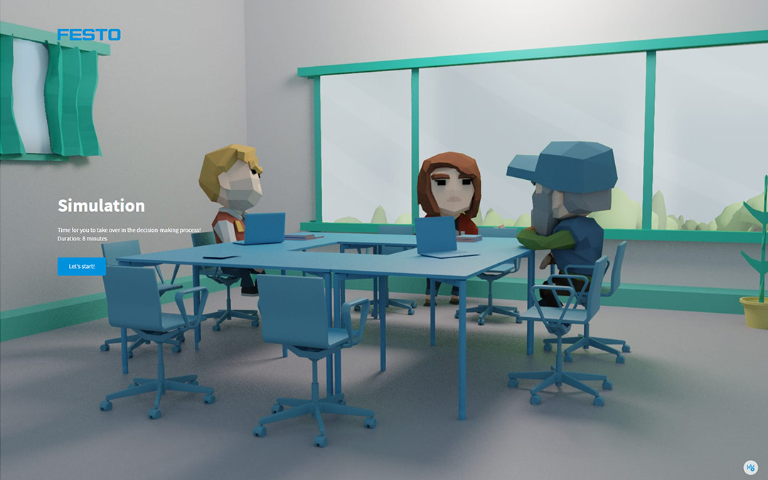 In the C-World of our customer Festo, learners enter the LMS via the 3D map and freely choose between six subject areas, each of which represents one of Festo's core competences. Chatbot Anna accompanies them as they explore the C-World. Gamification elements such as badges also increase motivation.
