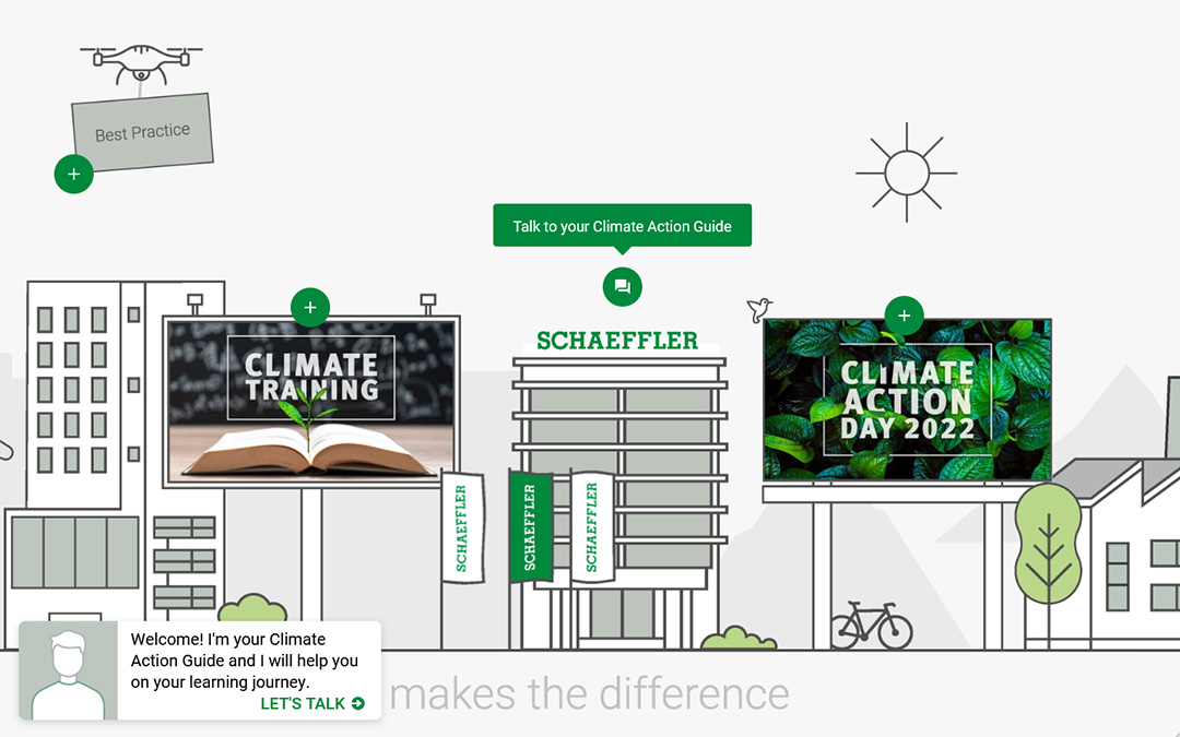 Schaeffler has set itself ambitious company-wide climate targets. To create a shared sense of the importance of climate protection, Climate Action Day was organised for all of the approximately 83,000 employees worldwide. The global Climate Action Day included about 4,000 workshops at around 200 locations. Matching learning content was made available via a 2D portal in the LMS. The portal served as an entry and orientation point for the learning contents and was accessible via an MS Teams channel as well as via the browser.